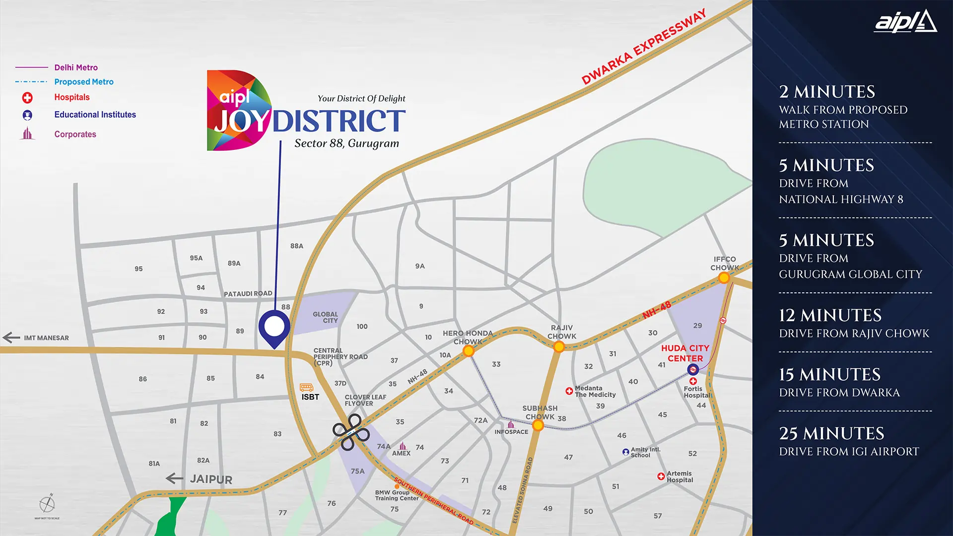 Experience unparalleled connectivity at AIPL Joy District in Sector 88, Gurgaon. This prime location is just a 2-minute walk from the Proposed Metro Station and offers a swift 5-minute drive to NH-48 (National Highway 8). Its proximity to Dwarka Expressway and the Gurgaon Global City ensures rapid access to Delhi and only a 25-minute drive to IGI Airport. This high-growth corridor in New Gurgaon makes it an exceptional New commercial investment opportunity, promising superior footfall and high ROI for your business.