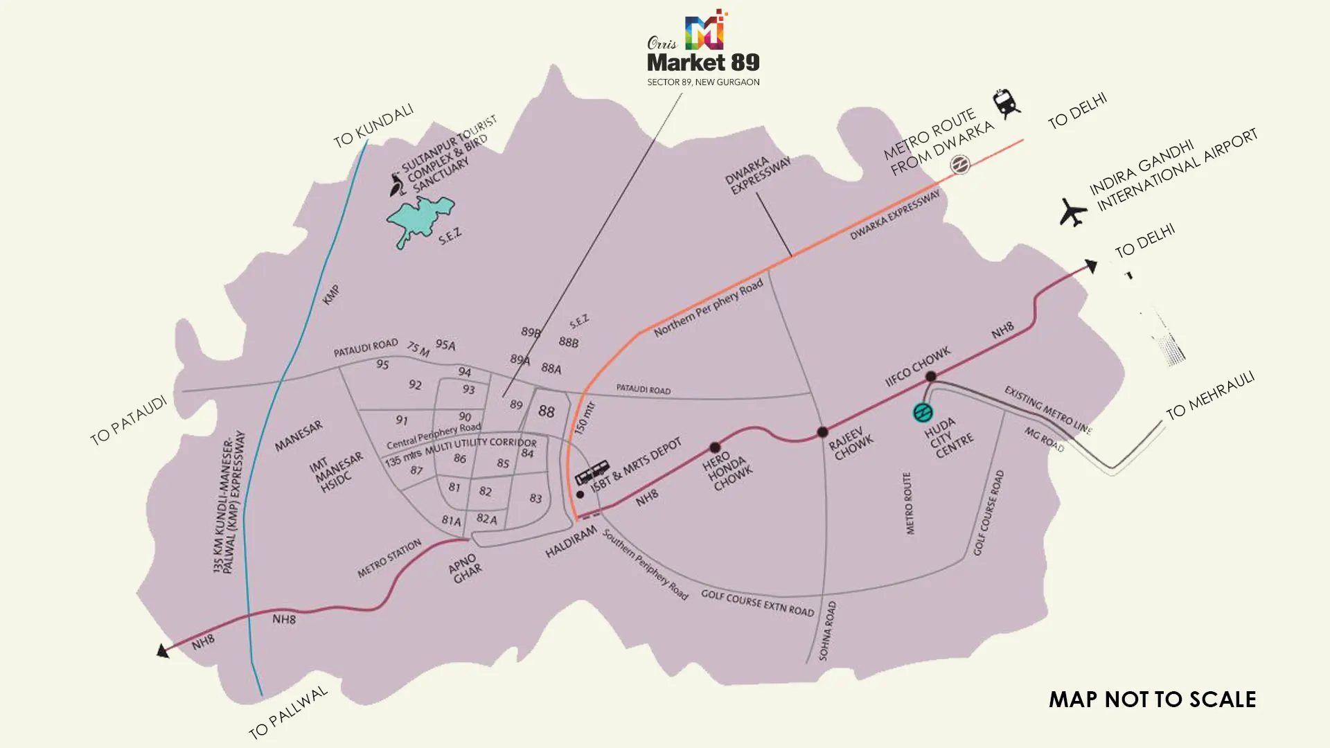 Orris Market 89 is strategically positioned at the epicenter of growth in Sector 89, Gurgaon. It offers exceptional connectivity via Pataudi Road and the 75-meter sector road, ensuring swift access to the Dwarka Expressway and NH-8. The true strength lies in its high residential catchment, surrounded by over 15,000 families today and projected to reach 50,000+ soon—guaranteeing consistent, high footfall. This prime location delivers excellent visibility, effortless accessibility, and impressive returns on investment, making it the commercial nucleus of New Gurgaon's most thriving corridor.
