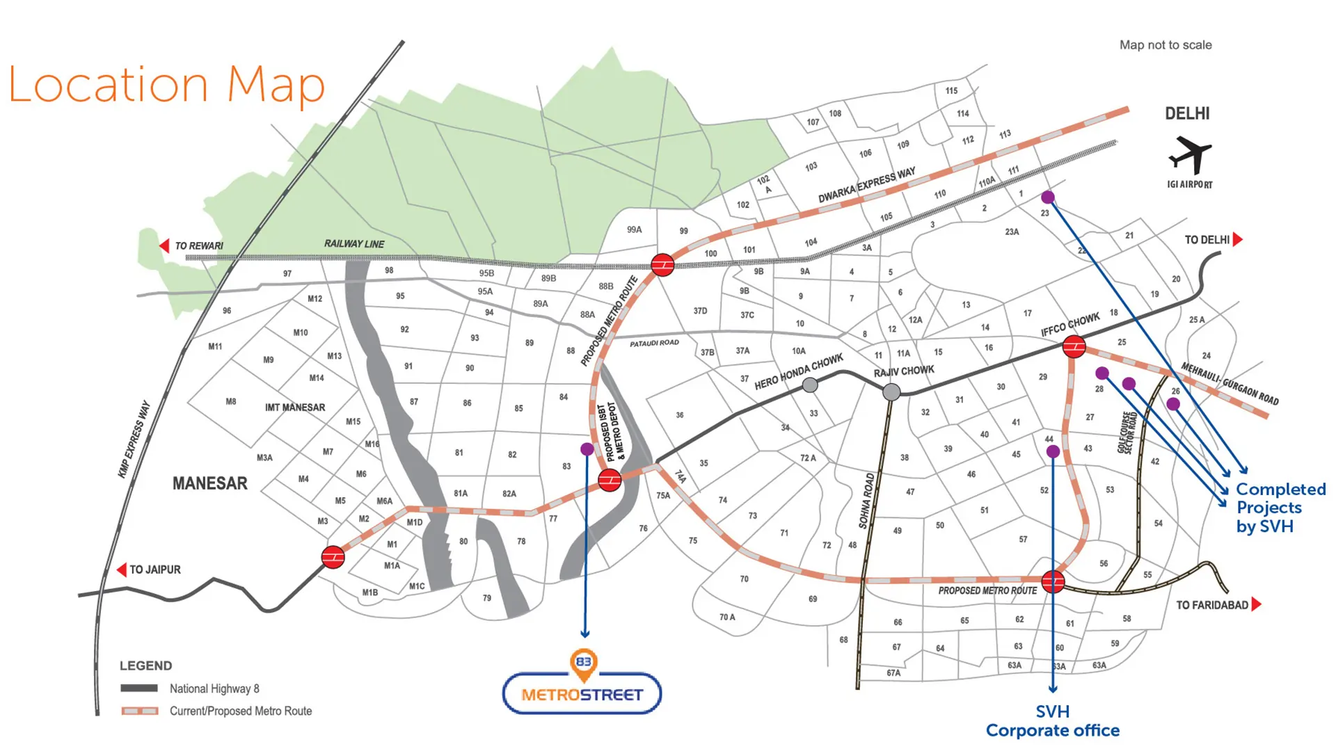 SVH 83 Metro Street boasts a superior strategic location in Sector 83, positioning it as a top investment on the Dwarka Expressway. It is situated on the 150-meter-wide road, providing immense visibility and accessibility. Crucially, the project is located bang opposite the proposed ISBT and Metro Hub, guaranteeing massive future footfall and exceptional connectivity to the IGI Airport and NH-8. Surrounded by a catchment area of over 40,000 upscale residential units, this prime address ensures a ready consumer base. For buyers and investors, this central location promises significant capital appreciation and sustained business activity, making it the most recommended commercial hub.