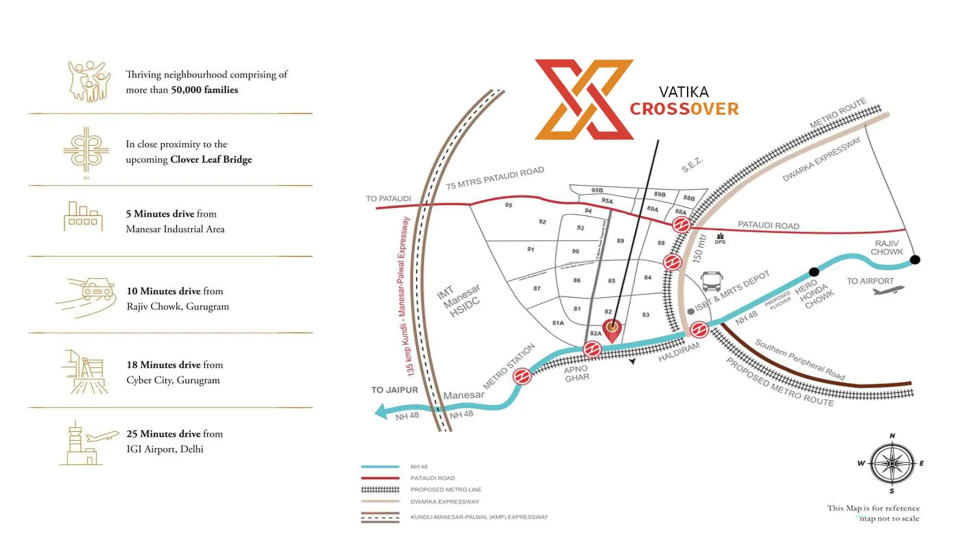 The strategic location of Vatika Crossover in Sector 82a, Gurgaon, establishes it as a superior Commercial Investment in the region's rapidly expanding Real Estate market. Offering premium SCO Plots, the project boasts an unparalleled advantage by being situated directly on NH48 (Delhi-Jaipur Highway) with an impressive 500 ft frontage, ensuring maximum visibility and seamless accessibility. This position provides signal-free connectivity to IGI Airport and is located on the planned Regional Rapid Transit System (RRTS) corridor. Furthermore, its integration within the larger Vatika India Next township guarantees a substantial captive consumer base of over 2 lakh residents, solidifying its potential for high returns and long-term value appreciation.